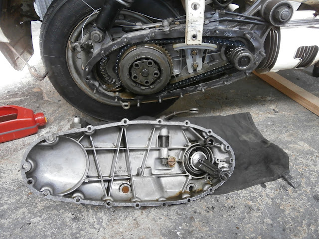 Ao instalar o braço novo no selector, ele não queria entrar no seu sítio. Tinha aumentado 0,5mm em altura e o espaço para o braço, por baixo dum degrau de alumínio, tem uma tolerância bastante apertada. Suponho que a Piaggio não quis estar a lidar com isto, nem com algumas operações de fabrico extra, para adicionarem um casquilho como o meu. Limei um pouco até entrar.