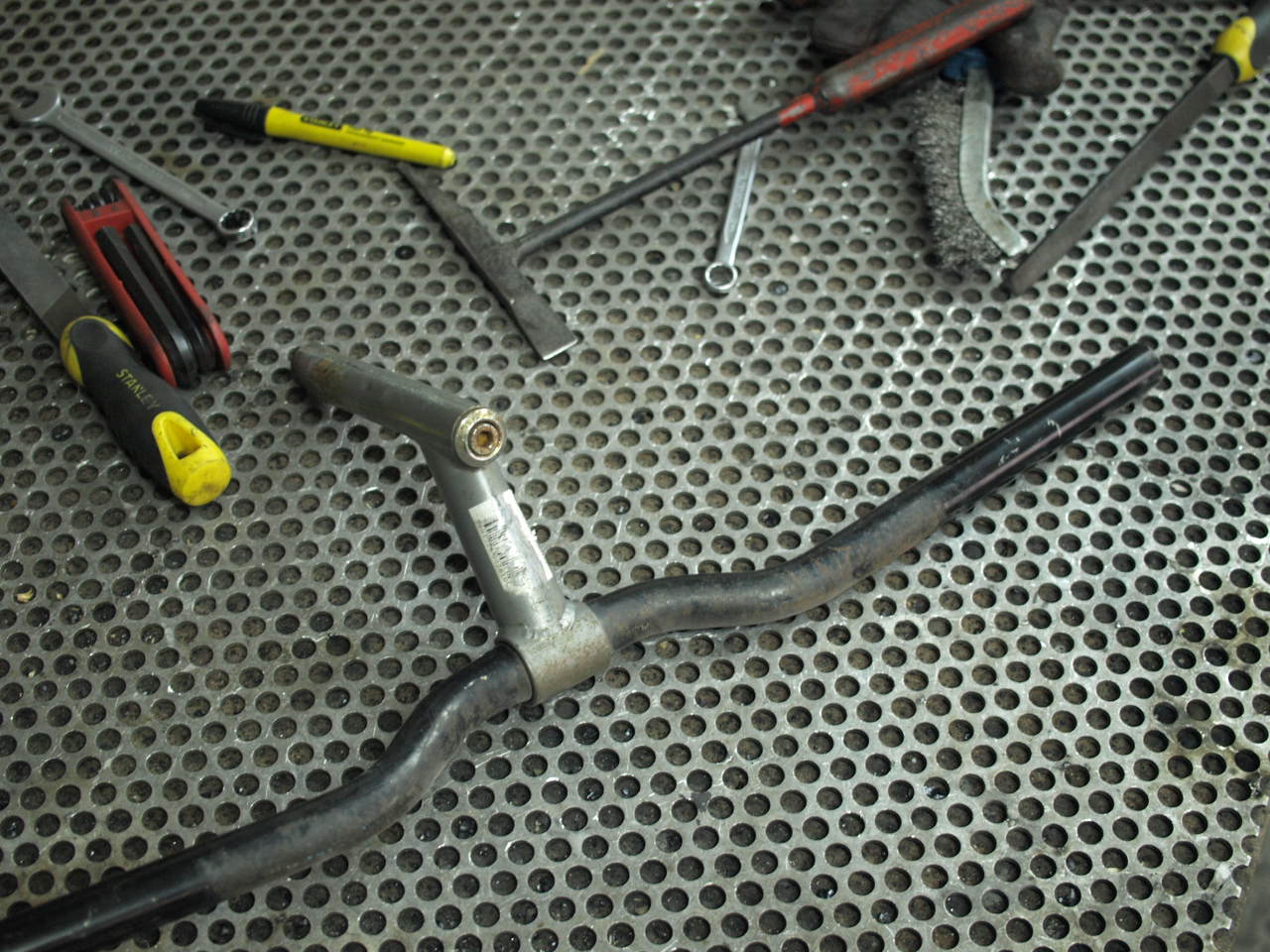 Passo 1: obter um guiador de bicicleta velho. Tem que ser em aço, não pode ser em alumínio! Os deuses da mecânica sorriem para nós pois o diâmetro interno de um guiador destes encaixa perfeitamente no pirilau dum escape de PX. (garantia não contratual)