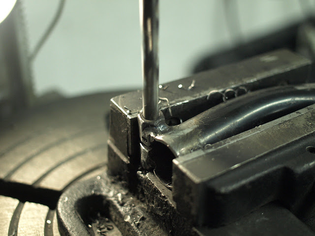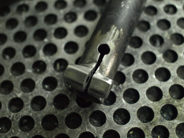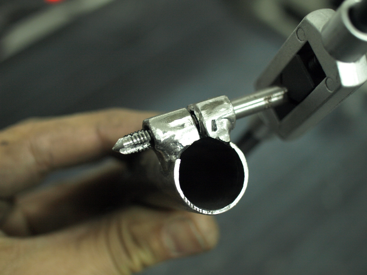 Passo 5: Usando a rebarbadora com disco de corte, criar um lenho que atravesse a porca e desemboque no furo do passo 3. Esta é uma manobra que exige habilidade média/ avançada na rebarbadora.
