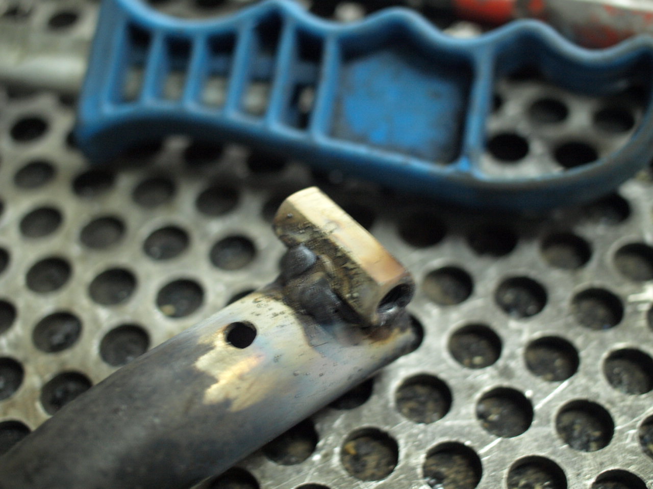 Passo 4: obter uma porca M6 extra-comprida (acho que se chamam porcas de ligação) e soldá-la à frente do furo. Aprender a tirar fotografias que não estejam tremidas.